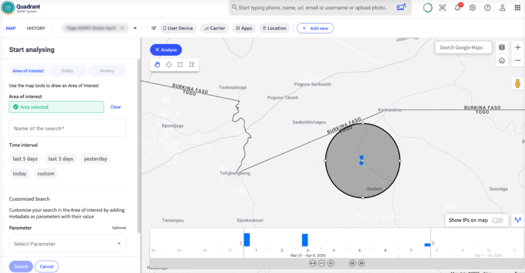 With the number confirmed active and monitored, shift to Quadrant. You need to understand past behaviour. Criminals may swap SIM cards, but the phone stays the same. That’s where Quadrant helps. It analyses historical advertisement data. You analyse known poaching spots and collect Ad IDs present. You already have the current movements of your POI from Discovery, so now you can use Quadrant to cross-reference the data, confirm the suspects’ Ad ID, and build a behavioural timeline covering weeks of his movement.
